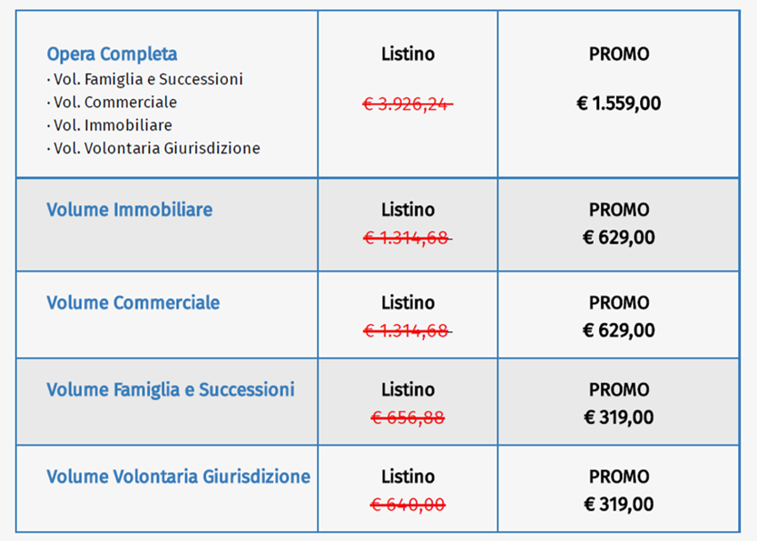 L’offerta dedicata ai Notai prevede l’acquisto di uno o più volumi o dell’opera completa con applicazione di un prezzo esclusivo e riservato per il primo anno senza rinnovo automatico.