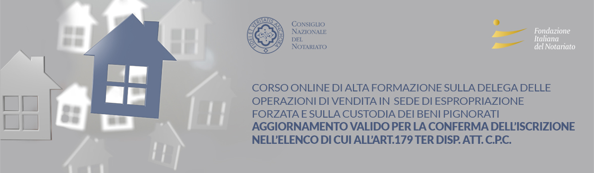 Il Consiglio Nazionale del Notariato, in collaborazione con la Fondazione Italiana del Notariato, organizza un corso di alta formazione sulla delega delle operazioni di vendita in sede di espropriazione forzata e custodia dei beni pignorati valido ai fini della conferma di iscrizione nell'elenco di cui all' art. 179 - ter disp. att. c.p.c.